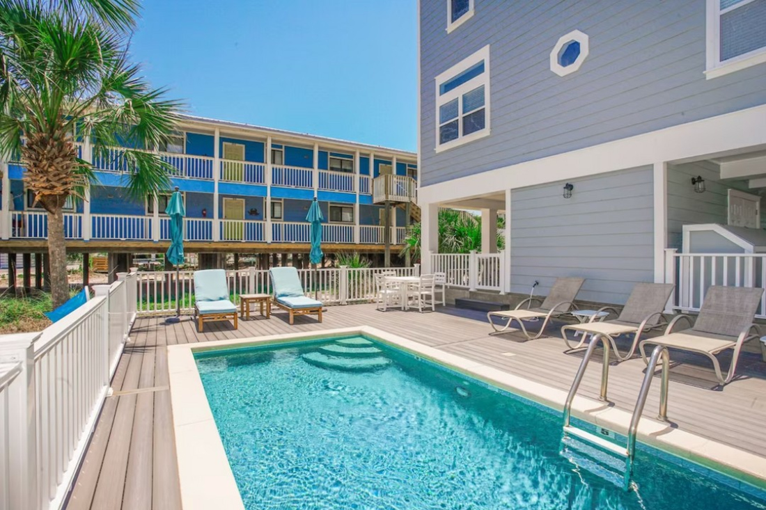 Casa De Le Sea is a bright beach home with 4 bedrooms and a backyard with a covered porch, gas grill, and foosball table, all with access to a complimentary 6-seater golf cart and 4 bikes.