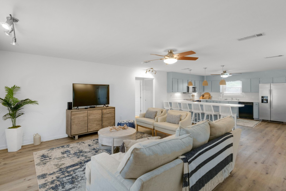 This charming 3-bedroom, 2-bathroom abode is situated minutes away from stunning, white sand beaches. Kitties Koop boasts a breezy front porch, complete with rocking chairs for a relaxing setting, ideally suited to unwind after a day at the beach.